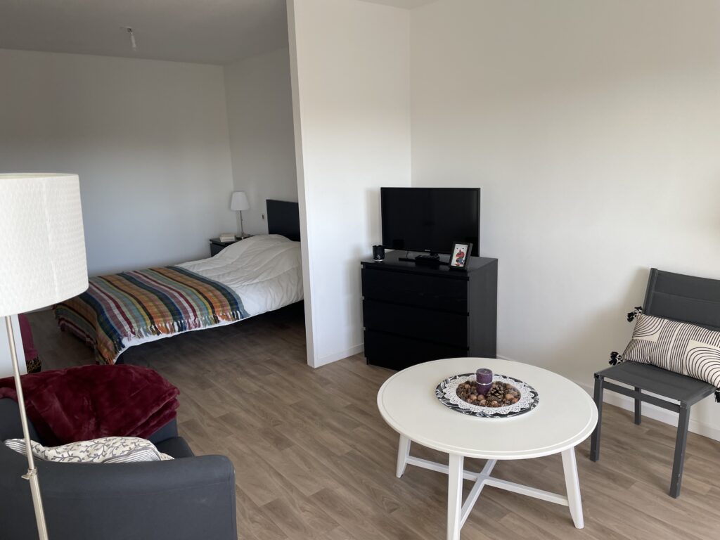 T1 de 33 m² : Séjour/chambre, petite cuisine avec kitchenette équipée d’un meuble sous évier, plaques de cuisson et réfrigérateur, salle d’eau avec douche et WC, entrée avec placard de rangement.