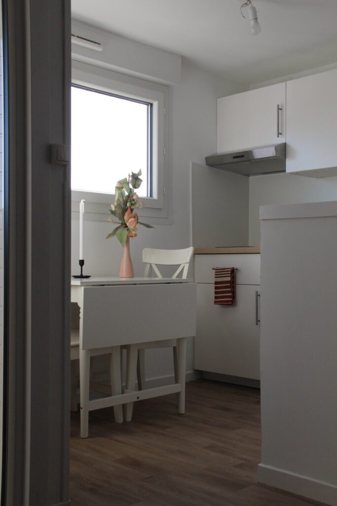 T2 de 48 m² : Séjour, cuisine équipée d’un meuble sous évier, plaques de cuisson et réfrigérateur, chambre, salle d’eau avec douche, WC, entrée avec placard de rangement.